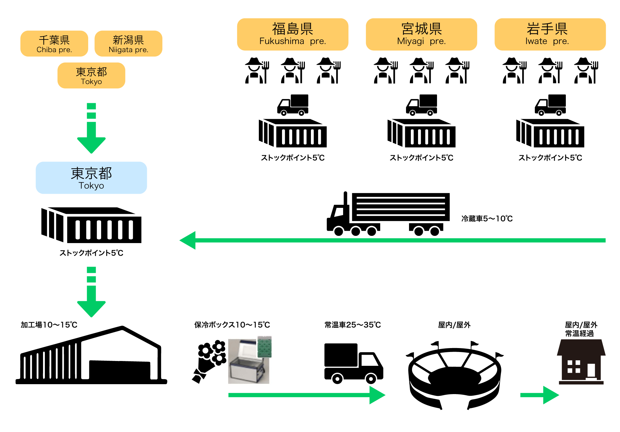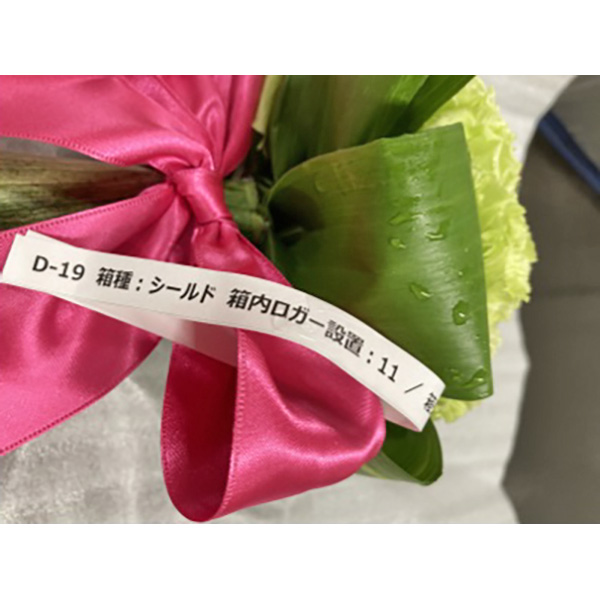 猛暑下のタイミングで出荷できるよう、生産依頼を行った各県の花材の圃場の状況、また各生産者施設から、各県に設置したストックポイントへの配送については、通常期の輸送と同様に実施(生産者保冷施設・前処理後)。ストックポイント以降の温湿度ロガーにより記録を行った